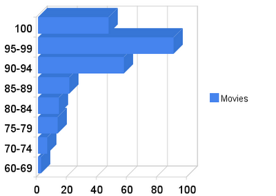 And... it turns out movie critics and public agree most of the time. 18.8% of the top 250 has very rare perfect 100 tomatometer score, 77.6% has extremely good score of 90 or more, 91.6% has still very good 80 or more score - perhaps critics are not as amazed by the movie as the audience, but they liked it anyway. There are just 19 (7.6%) movies with scores in their 70s, and 2 (0.8%) in their 60s - where we can genuinely says the critics were largely unimpressed. Not a single movie has a horrible score like Transformers 2's 19.